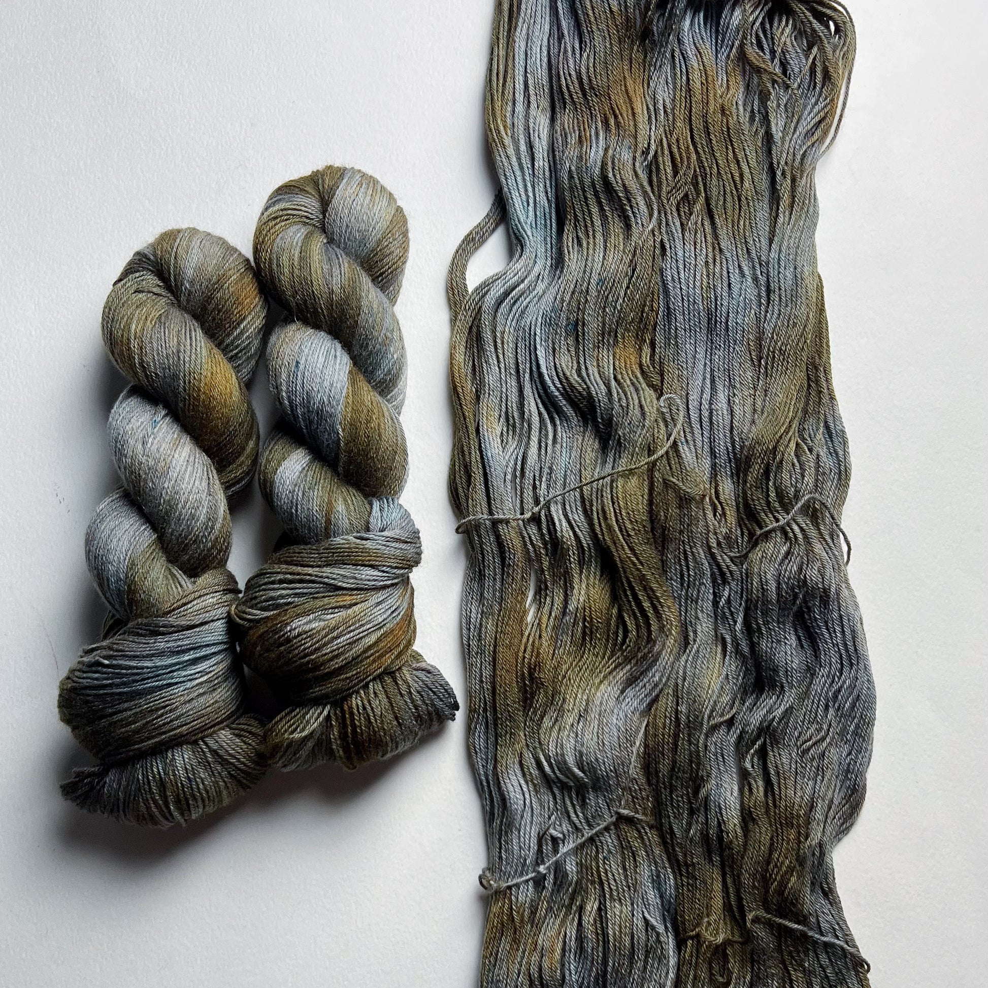 A variegated hank of light and medium grays, and olivey brown with teal and black speckles. It is inspired by the scene where Arwen is riding with a dying Frodo away from the Nazgul, and she is finally able to harness the power of her people.