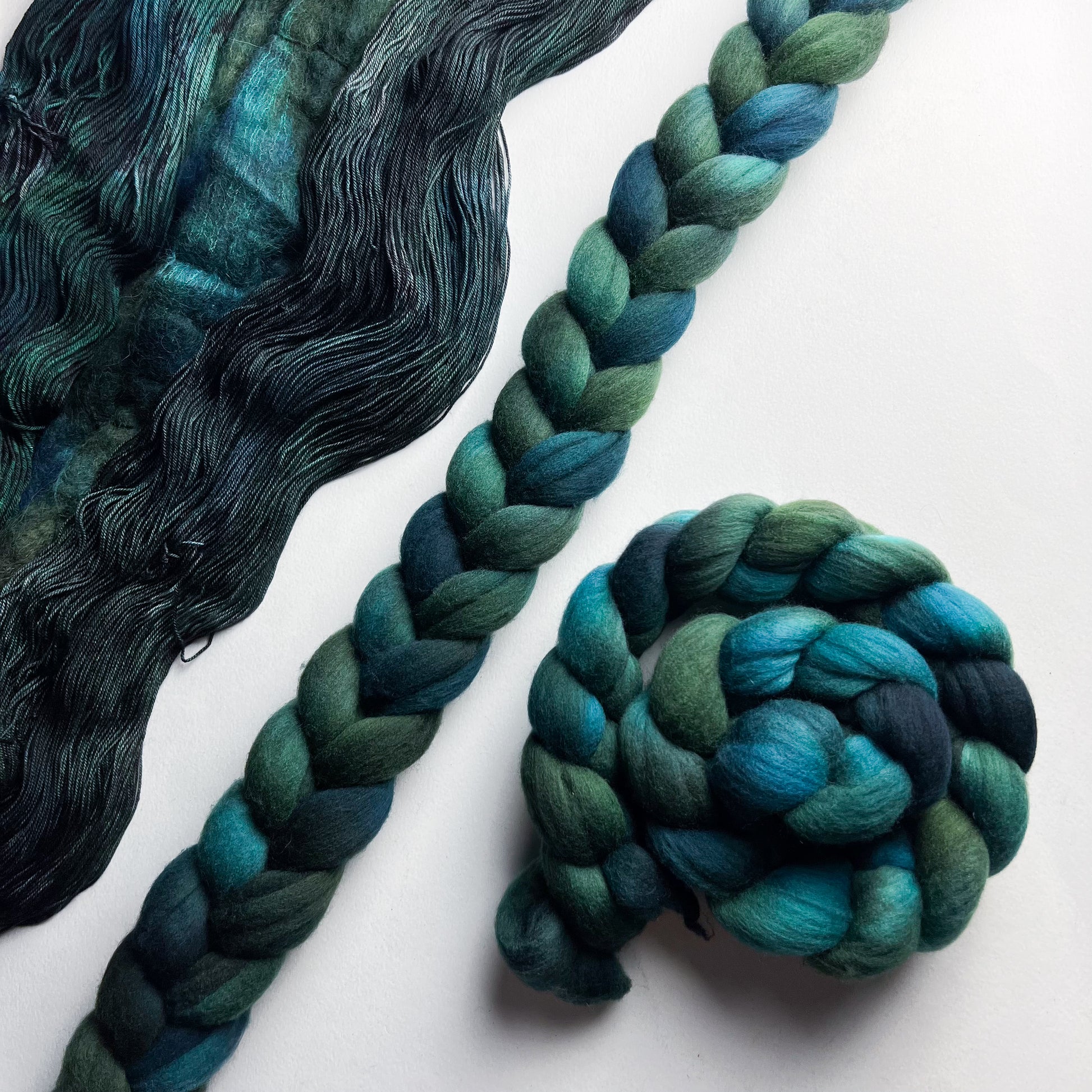 A variegated colourway of phthalo green, aqua, and navy with a moody brown-purple speckle.