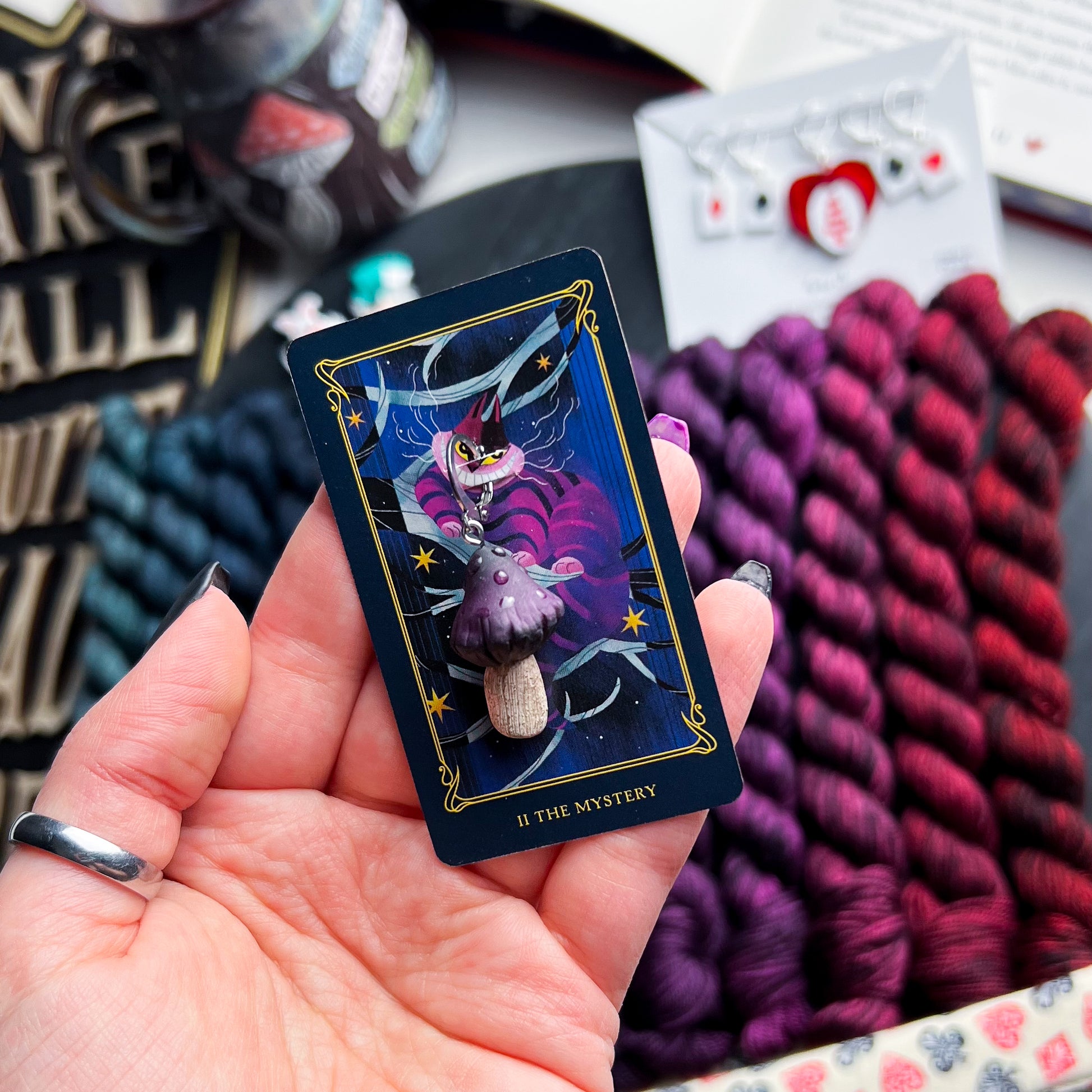 Isabella of Isabella Ellis Studios custom made these cute progress keepers for our Alice in Wonderland-inspired box! The toxic mushrooms are hand-sculpted using polymer clay, and then painted to add even more detail. They even come on a ridiculously cute Alice tarot card! Each one is different. Which will you receive??
