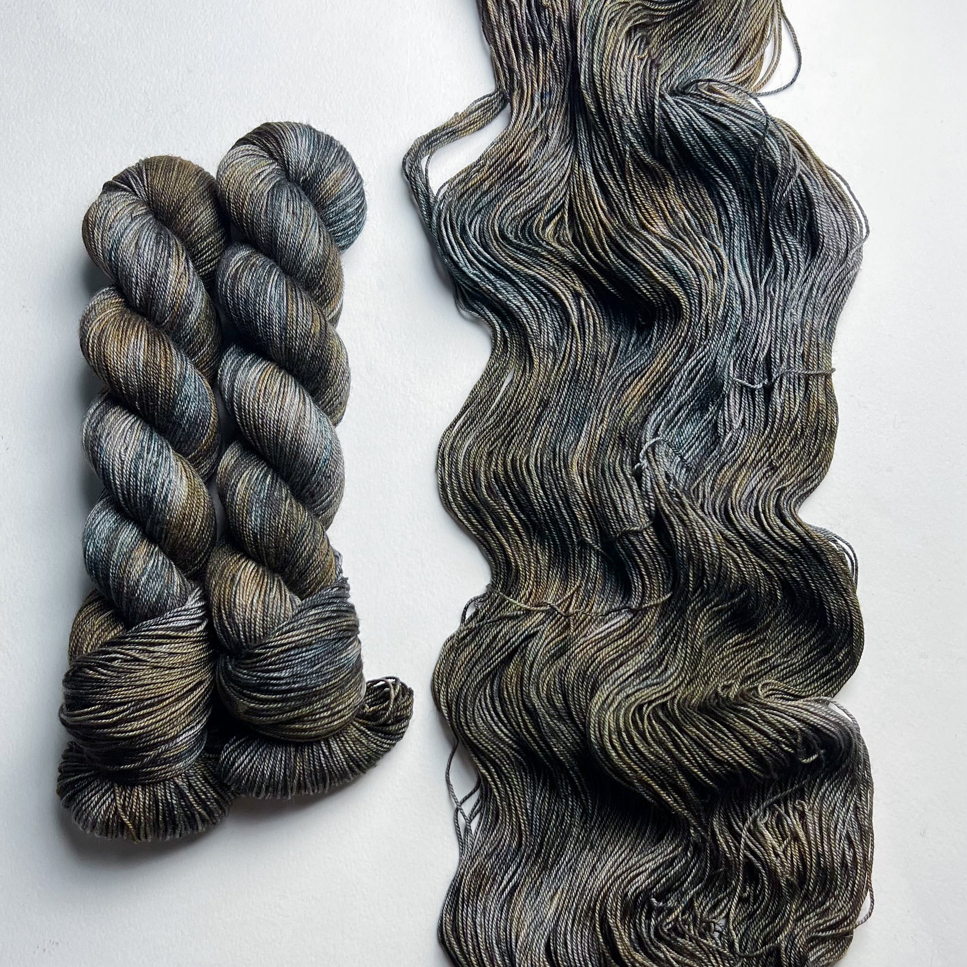 A variegated hank of light and medium grays, and olivey brown with teal and black speckles. It is inspired by the scene where Arwen is riding with a dying Frodo away from the Nazgul, and she is finally able to harness the power of her people.