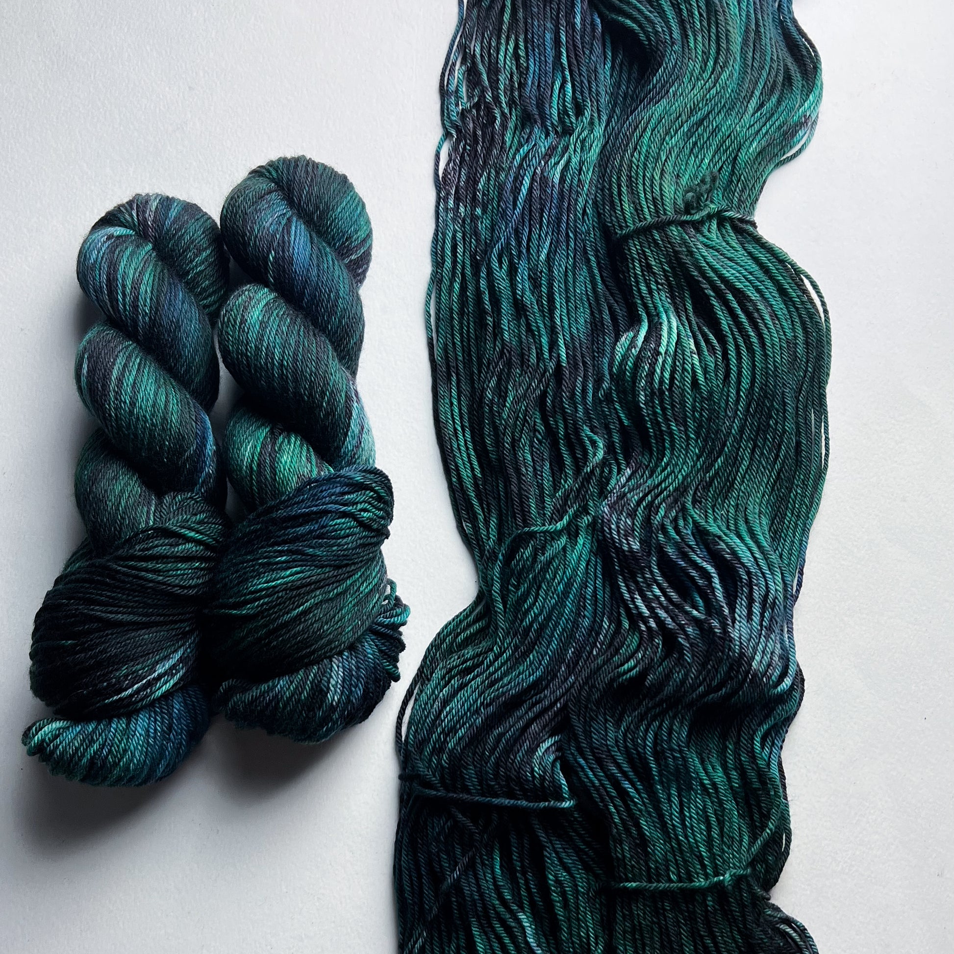 A variegated colourway of phthalo green, aqua, and navy with a moody brown-purple speckle.