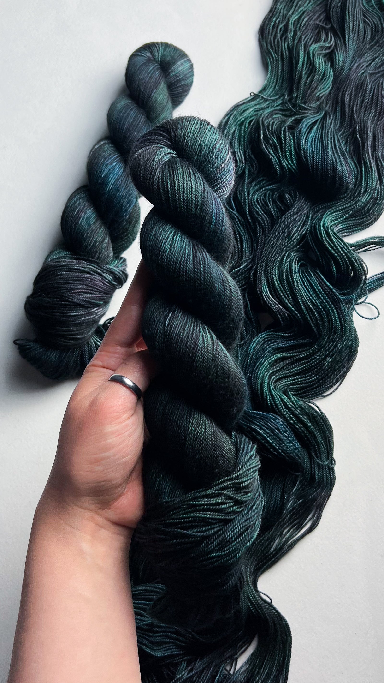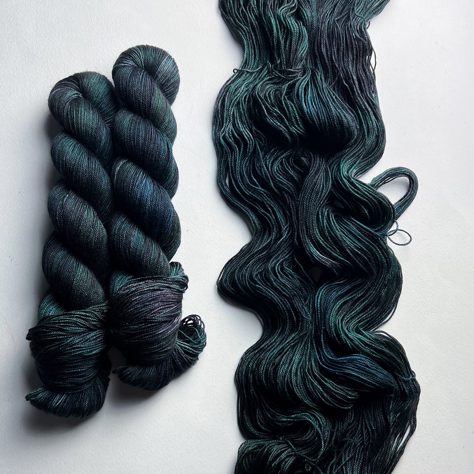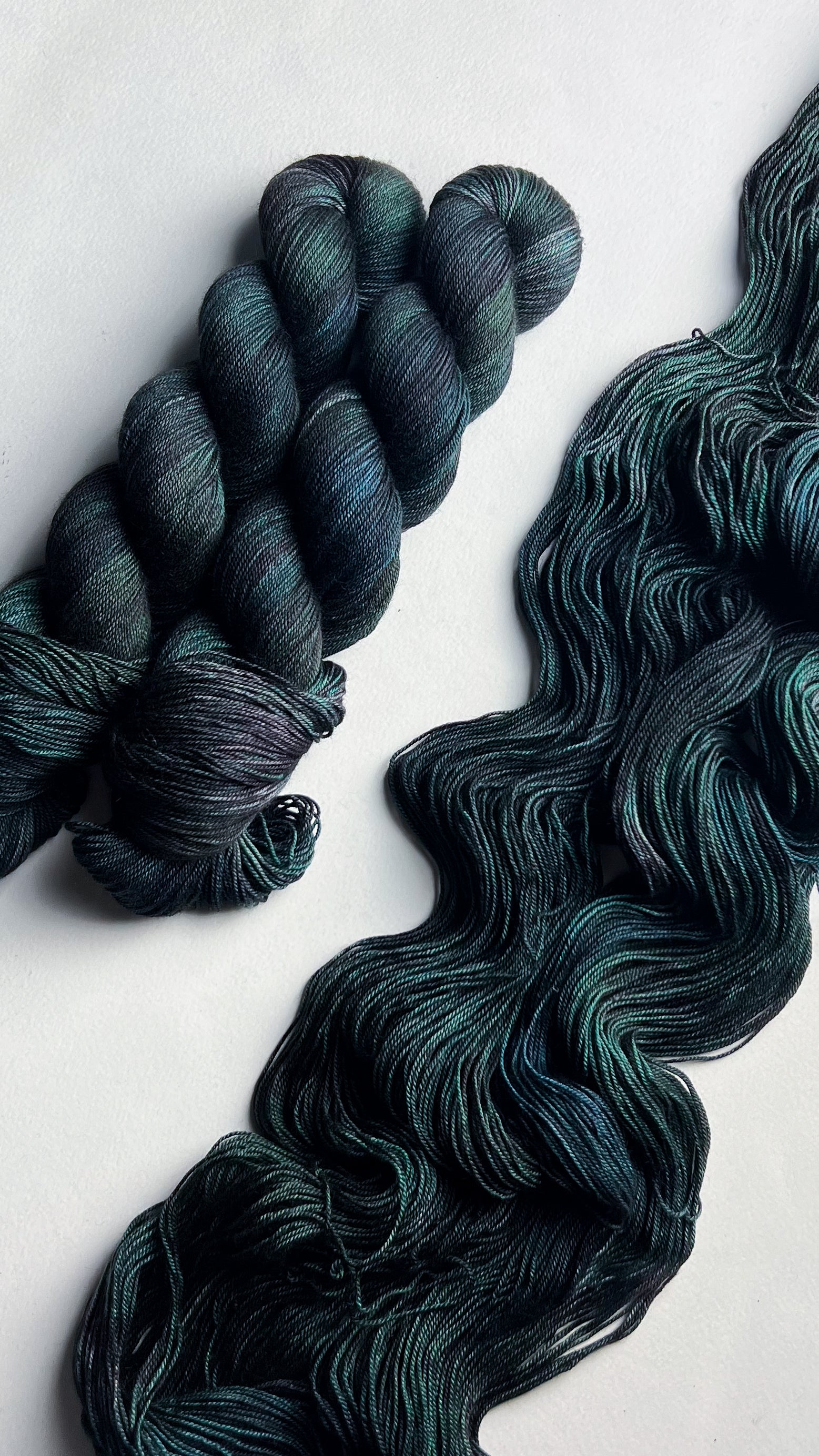 A variegated colourway of phthalo green, aqua, and navy with a moody brown-purple speckle.